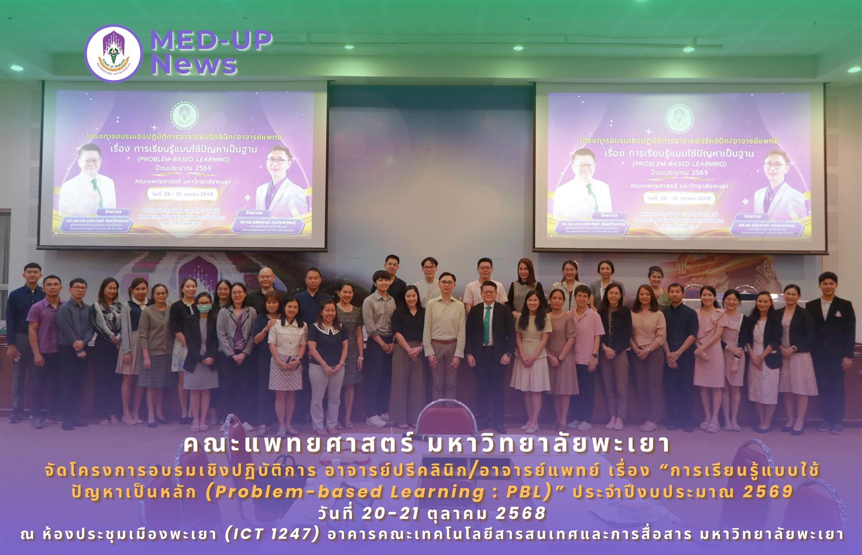 วันที่ 20–21 ตุลาคม 2568 คณะแพทยศาสตร์ มหาวิทยาลัยพะเยา จัดโครงการอบรมเชิงปฏิบัติการอาจารย์ปรีคลินิก/อาจารย์แพทย์ เรื่อง “การเรียนรู้แบบใช้ปัญหาเป็นหลัก (Problem-based Learning : PBL)” ประจำปีงบประมาณ 2569 เพื่อพัฒนาองค์ความรู้และทักษะการจัดการเรียนการสอนตามแนวทาง PBL ให้กับคณาจารย์ของคณะอย่างมีประสิทธิภาพและเป็นไปในทิศทางเดียวกัน แพทย์หญิงมัลลิกา ขวัญเมือง รองคณบดีฝ่ายวิชาการ พัฒนาคุณภาพองค์กรและกิจการนิสิต ให้เกียรติเป็นประธานในพิธีและกล่าววัตถุประสงค์ของการจัดโครงการในครั้งนี้ ณ ห้องประชุมเมืองพะเยา (ICT 1247) อาคารคณะเทคโนโลยีสารสนเทศและการสื่อสาร มหาวิทยาลัยพะเยา